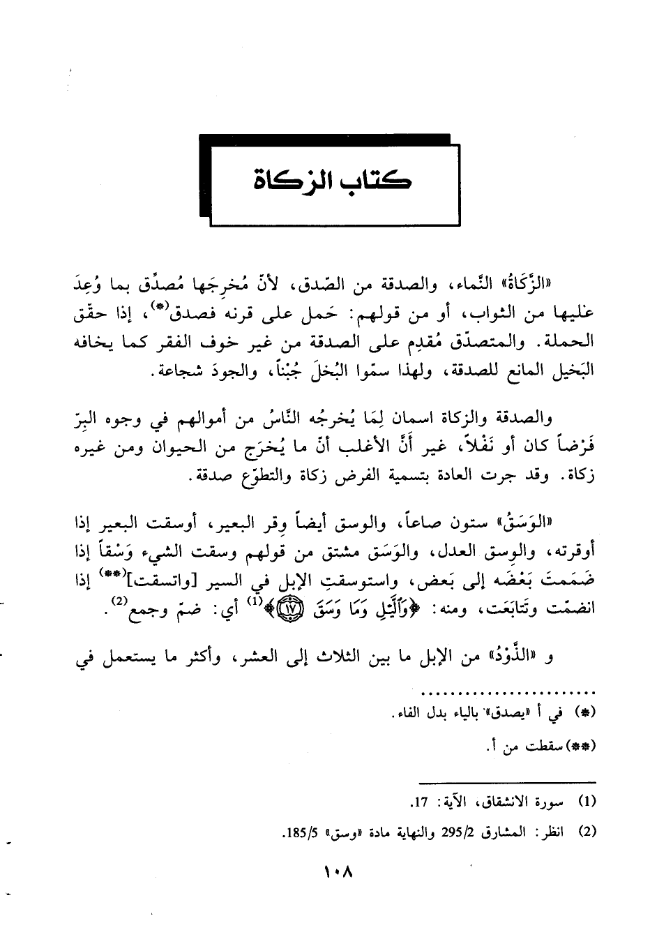 وَالصَّدَََقَة وَالزَّكَاة اسمان لما يُخرجهُ النَّاس من أَمْوَالهم فِي وُجُوه الْبر فرضا كَانَ أَو نفلا، غير أَن الْأَغْلَب أَن مَا يخرج من الْحَيَوَان وَمن غَيره زَكَاة. وَقد جرت الْعَادة بِتَسْمِيَة الْفَرْض زَكَاة والتطوع صَدَقَة.