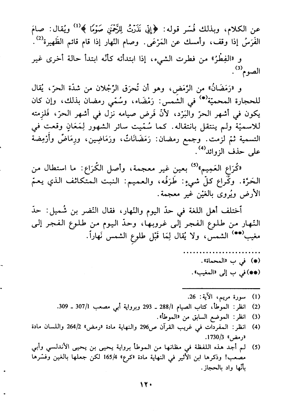 عَن الْكَلَام، وَبِذَلِك فسر قَوْله: {إنى نذرت للرحمن صوما} وَيُقَال: صَامَ الْفرس إِذا وقف، وَأمْسك عَن المرعى. وَصَامَ النَّهَار إِذا قَامَ قَائِم الظهيرة.