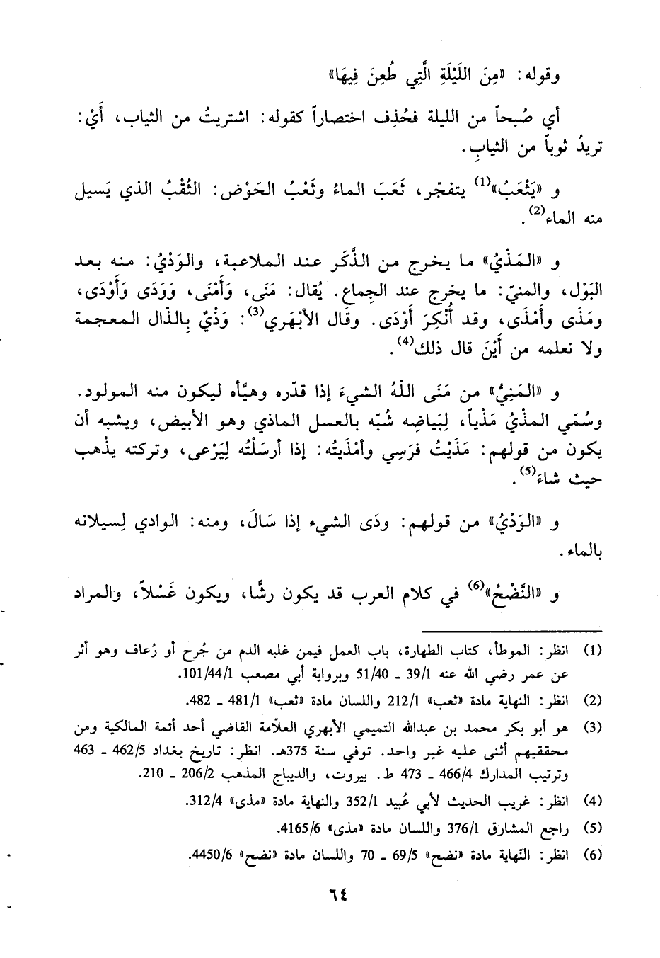 و" الْمَنِيّ " من منى الله الشَّيْء إِذا قدره وهيأه ليَكُون مِنْهُ الْمَوْلُود. وَسمي الْمَذْي مذيا لبياضه شبه بالعسل الماذي وَهُوَ الْأَبْيَض، وَيُشبه أَن يكون من قَوْلهم: مذيت فرسي وأمذيته: إِذا أَرْسلتهُ ليرعى، وَتركته يذهب حَيْثُ شَاءَ.
