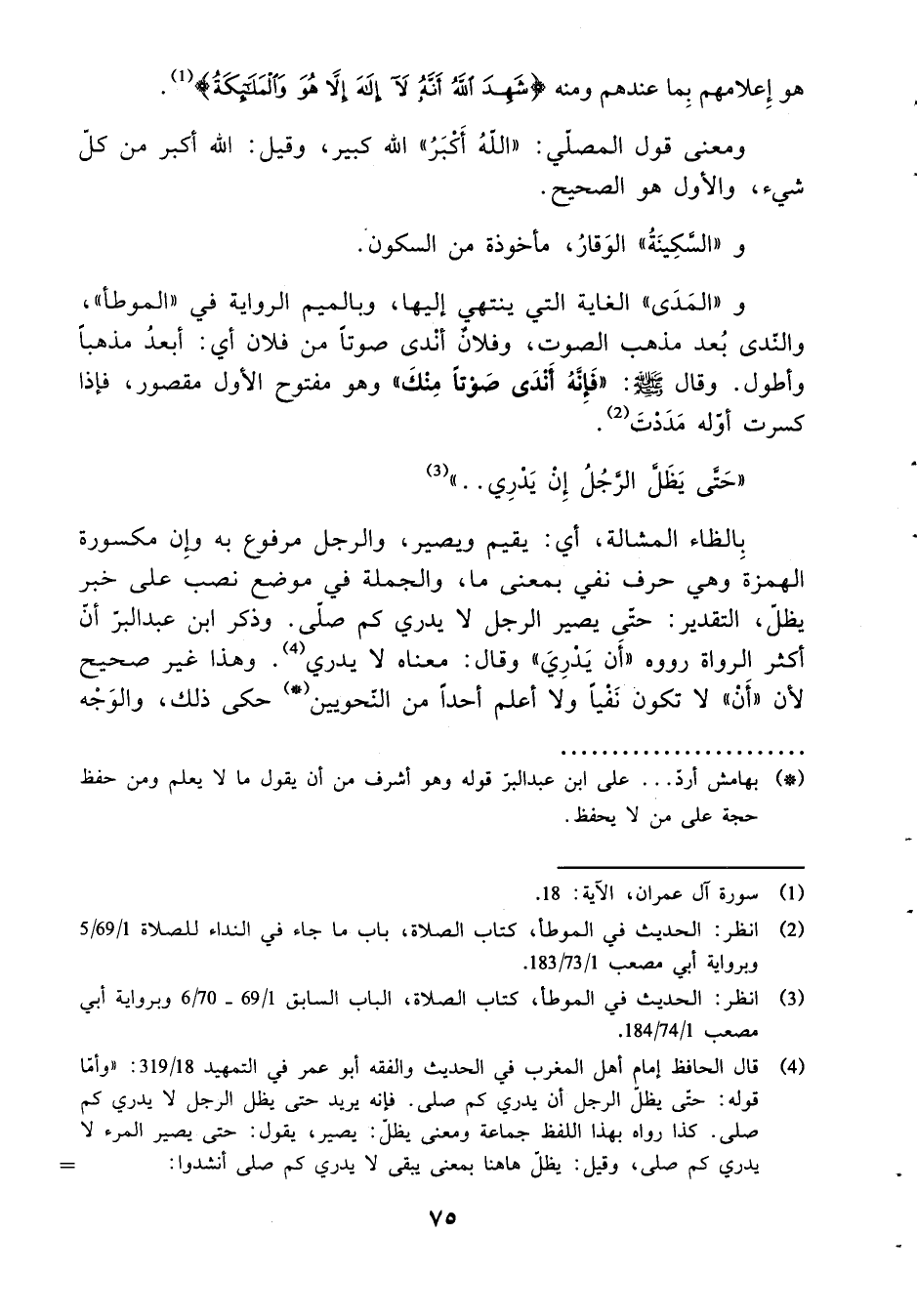و" المدى " الْغَايَة الَّتِي ينتهى إِلَيْهَا، وبالميم الرِّوَايَة فِي " الْمُوَطَّأ "، والندى بعد مَذْهَب الصَّوْت، وَفُلَان أندى صَوتا من فلَان أَي: أبعد مذهبا وأطول. وَقَالَ - صَلَّى اللَّهُ عَلَيْهِ وَسَلَّم َ -: " فَإِنَّهُ أندى صَوتا مِنْك " وَهُوَ مَفْتُوح الأول مَقْصُور، فَإِذا كسرت أَوله مددت.