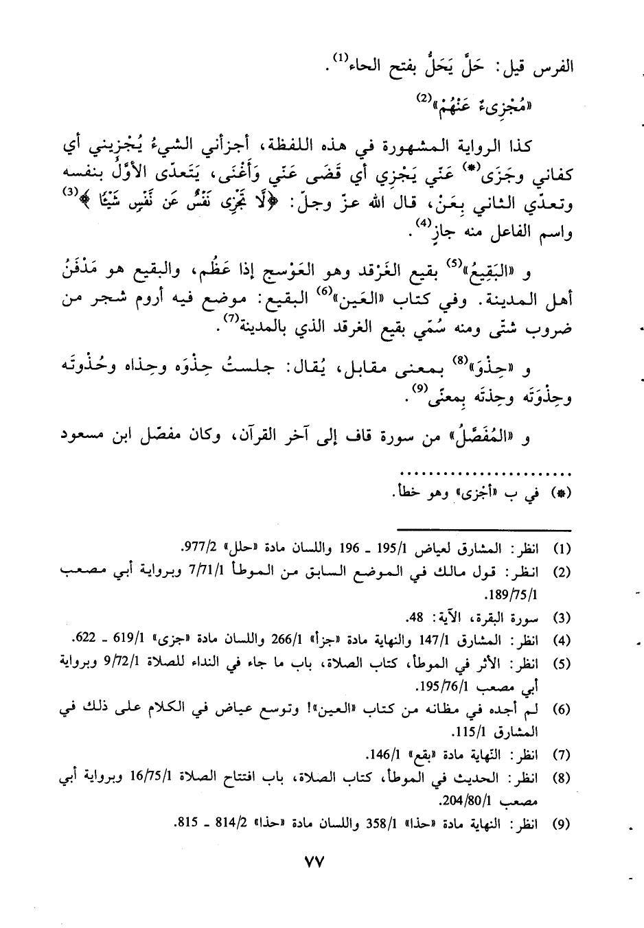 كَذَا الرِّوَايَة الْمَشْهُورَة فِي هَذِه اللَّفْظَة، أجزأني الشَّيْء يجزيني أَي كفاني وجزى عني يَجْزِي أَي قضى عَنى وأغنى، يتَعَدَّى الأول بِنَفسِهِ وتعدي الثَّانِي بعن، قَالَ الله عز وَجل: {لَا تجزى نفس عَن نفس شَيْئا} وَاسم الْفَاعِل مِنْهُ جَازَ.