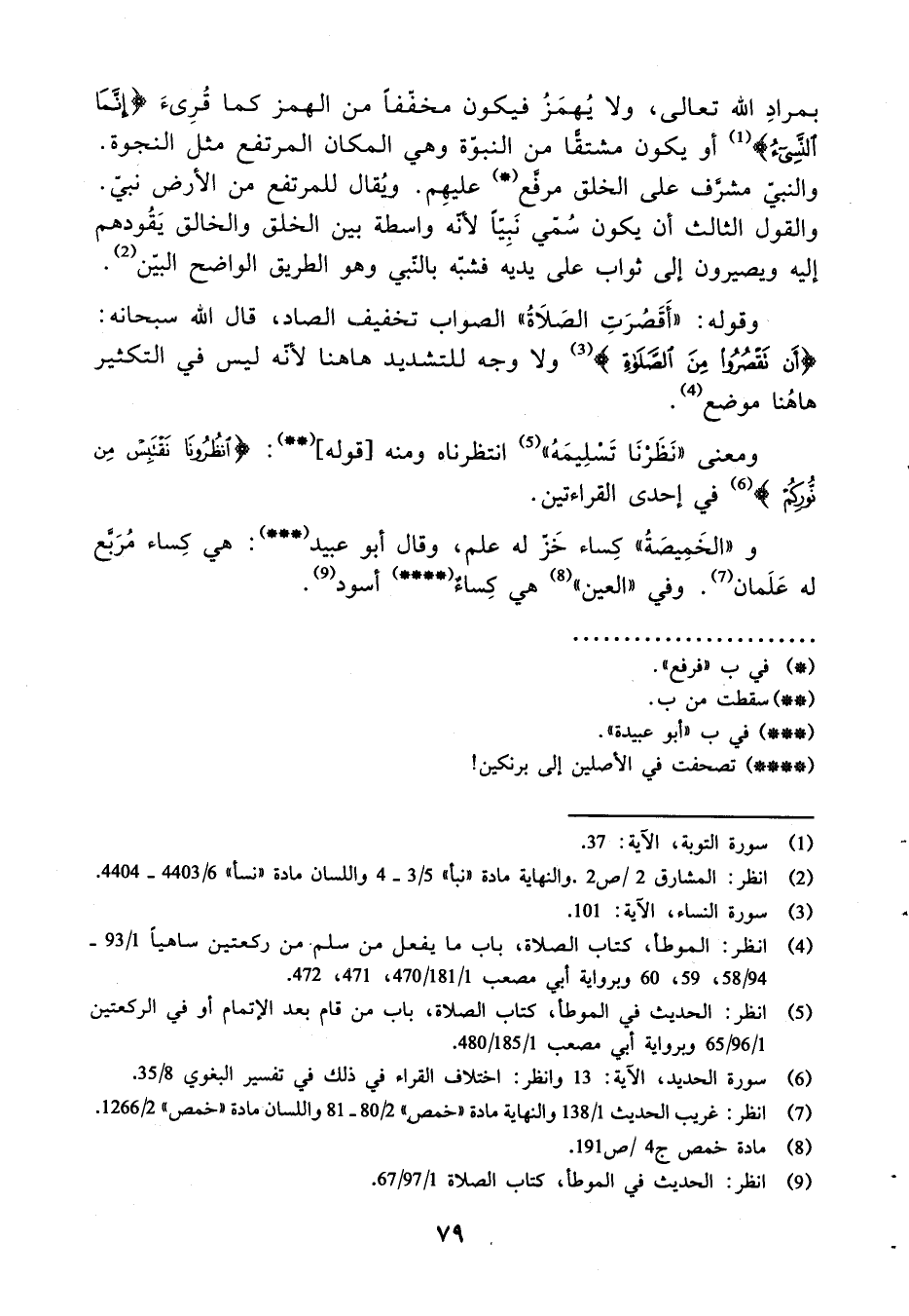 بِمُرَاد الله تَعَالَى، وَلَا يهمز فَيكون مخففا من الْهَمْز كَمَا قرىء {إِنَّمَا النسىء} أَو يكون مشتقا من النُّبُوَّة وَهِي الْمَكَان الْمُرْتَفع مثل النجوة. وَالنَّبِيّ مشرف على الْخلق مرفع عَلَيْهِم. وَيُقَال للمرتفع من الأَرْض نَبِي. وَالْقَوْل الثَّالِث أَن يكون سمي نَبيا لِأَنَّهُ وَاسِطَة بَين الْخلق والخالق يقودهم إِلَيْهِ ويصيرون إِلَى ثَوَاب على يَدَيْهِ فَشبه بِالنَّبِيِّ وَهُوَ الطَّرِيق الْوَاضِح الْبَين.
