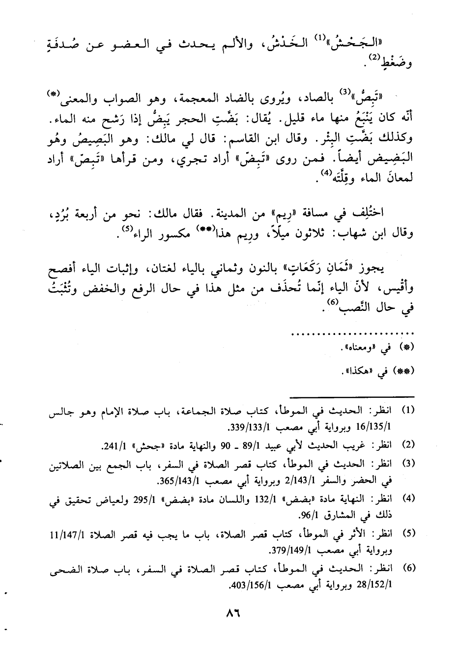 " تبص " بالصَّاد، ويروى بالضاد الْمُعْجَمَة، وَهُوَ الصَّوَاب وَالْمعْنَى أَنه كَانَ يَنْبع مِنْهَا مَاء قَلِيل. يُقَال: بضت الْحجر يبض إِذا رشح مِنْهُ المَاء. وَكَذَلِكَ بضت الْبِئْر. وَقَالَ ابْن الْقَاسِم: قَالَ لى مَالك: وَهُوَ البصيص وَهُوَ البضيض أَيْضا. فَمن روى " تبض " أَرَادَ تجْرِي، وَمن قَرَأَهَا " تبص " أَرَادَ لمعان المَاء وقلته.