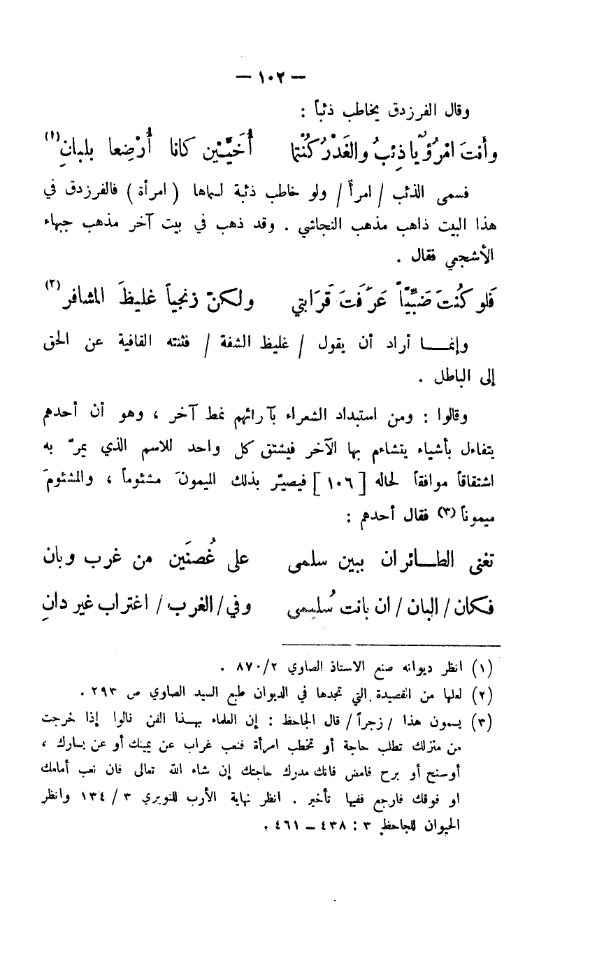 فسمى الذئب/ امرأ/ ولو خاطب ذئبة لسماها (امرأة) فالفرزدق في هذا البيت ذاهب مذهب النجاشي. وقد ذهب في بيت آخر مذهب جبهاء الأشجعي فقال.
