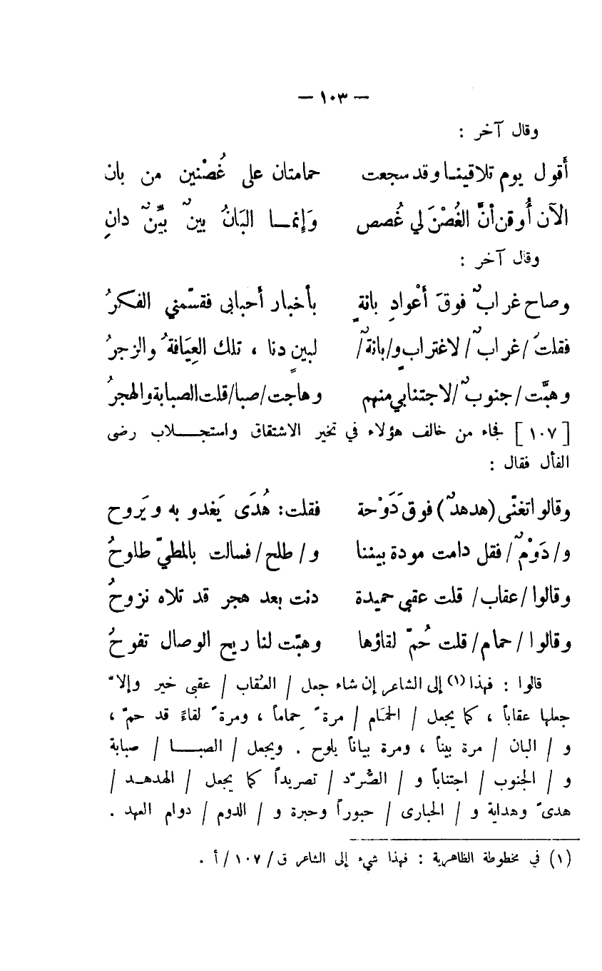 قالوا: فهذا إلى الشاعر إن شاء جعل/ العقاب/ عقى خير وإلا جعلها عقابا، كما يجعل/ الحمام/ مرة حماما، ومرة لقاء قد حم، والبان/ مرة بينا، ومرة بيانا يلوح. ويجعل/ الصبا/ صبابة/ والجنوب/ اجتنابا/ والصرد/ تصريدا كما يجعل/ الهدهد/ هدى وهداية/ والحبارى/ حبورا وحبرة/ والدوم/ دوام العهد.