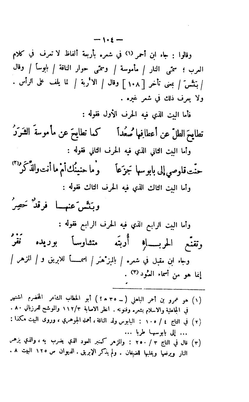 وقالوا: جاء ابن أحمر في شعره بأربعة ألفاظ لا تعرف في كلام العرب؛ سمى النار/ مأموسة/ وسمى حوار الناقة/ بابوسا/ وقال/ بنس/ بمعنى تأخر وقال/ الأربة/ لما يلف على الرأس.