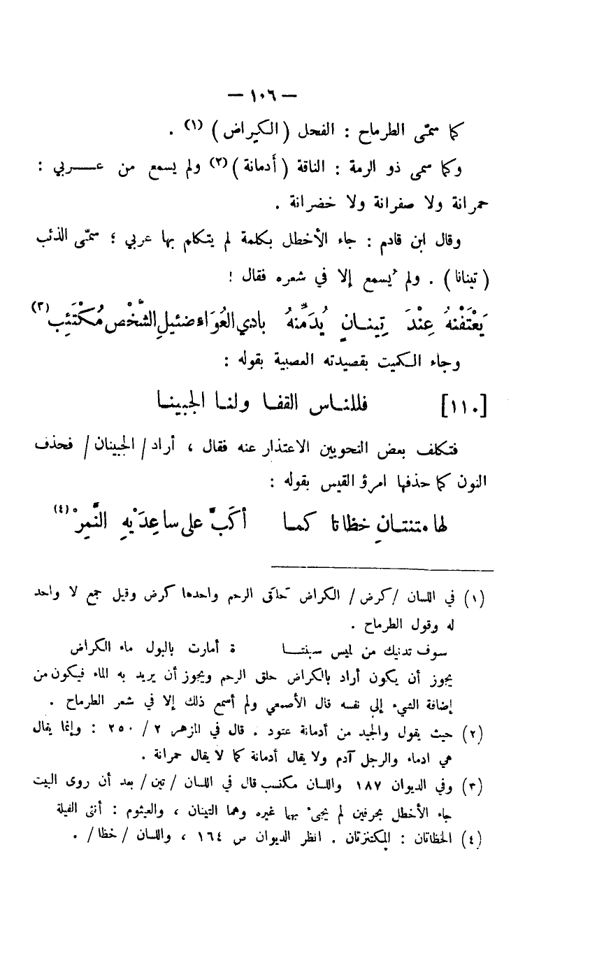 وقال ابن قادم: جاء الأخطل بكلمة لم يتكلم بها عربي؛ سمى الذئب (تينانا). ولم يسمع إلا في شعره فقال: