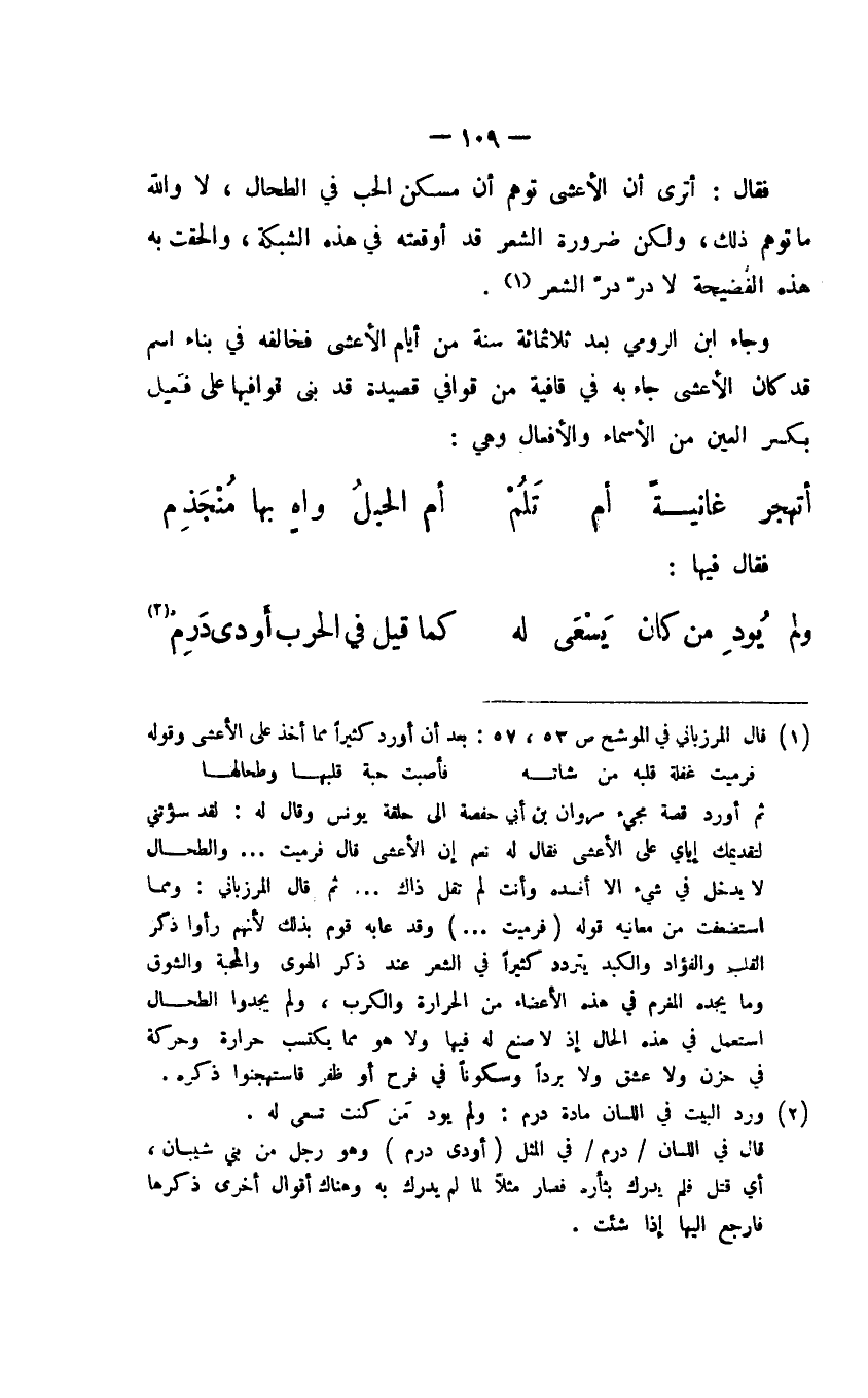 فقال: أترى أن الأعشى توهم أن مسكن الحب في الطحال، لا والله ما توهم ذلك، ولكن ضرورة الشعر قد أوقعته في هذه الشبكة، والحقت به هذه الفضحية لا در در الشعر.