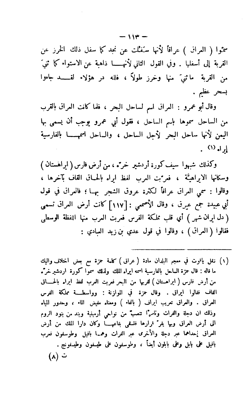 وقال أبو عمرو: العراق اسم لساحل البحر، فلما كانت العراق بالقرب من الساحل سموها باسم الساحل، فقول أبي عمرو يوجب أن يسمى بها اليمن لأنها ساحل البحر لأجل الساحل، والساحل اسمها بالفارسية إيراه.