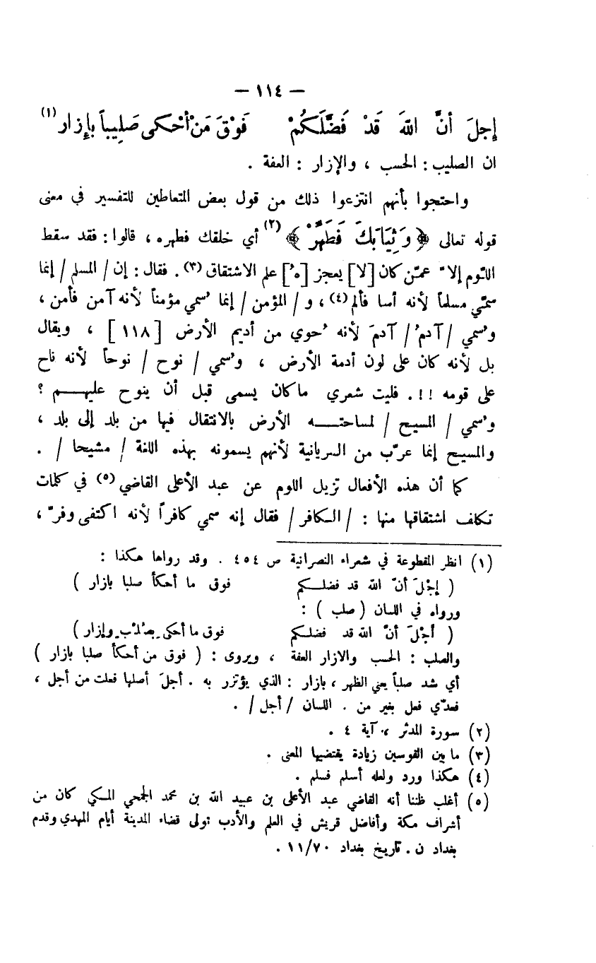 واحتجوا بأنهم انتزعوا ذلك من قول بعض المتعاطين للتفسير في معنى قوله تعالي {وثيابك فطهر} أي خلقك فطهره، قالوا: فقد سقط اللوم إلا عمن كان (لا) يعجز (هـ) علم الاشتقاق. فقال: إن/ المسلم/ إنما سمي مسلما لأنه أما فألم، والمؤمن/ إنما سمي مؤمنا لأنه آمن فأمن، ومسمي/ آدم/ آدم لأنه حوي من أديم الأرض، ويقال بل لأنه كان على لون أدمة الأرض، وسمي/ نوح/ نوحا لأنه ناح على قومه! ! . فليت شعري ما كان يسمى قبل أن ينوح عليهم؟ وسمي/ المسيح/ لمساحته الأرض بالانتقال فيها من بلد إلى بلد، والمسيح إنما عرب من السريانية لأنهم يسمونه بهذه اللغة/ مشيحا/.