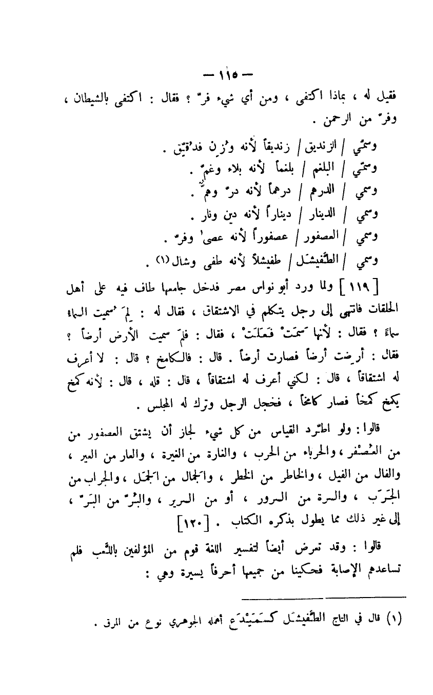 قالوا: ولو اطرد القياس من كل شيء لجاز أن يشتق العصفور من العصفر، والحرباء من الحرب، والغارة من الغيرة، والعار من العير، والفال من الفيل، والخاطر من الخطر، والجمال من الجمل، والجراب من الجرب، والسرة من السرور، أو من السرير، والبر من البر، إلى غير ذلك ما يطول بذكره الكتاب.