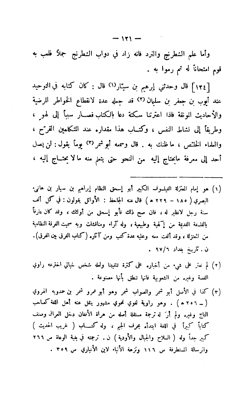 قال وحدثني إبراهيم بن سيار قال: كان كتابه في التوحيد عند أيوب بن جعفر بن سليمان قد جعله عدة لا نقطاع الخواطر المرضية والأحاديث المونقة فاذا اعترتنا سكتة دعا بالكتاب فصار سببا إلى لهو، وطريقا إلى نشاط النفس، وكتاب هذا مقداره عند المتكلمين القرح، والعلماء الخلتص، ما ظنك به. قال وسمعه أبو شمر يوما يقول: لن يصل أحد إلى معرفة ما يحتاج إليه من النحو حتى يتعلم منه ما لا يحتاج إليه،