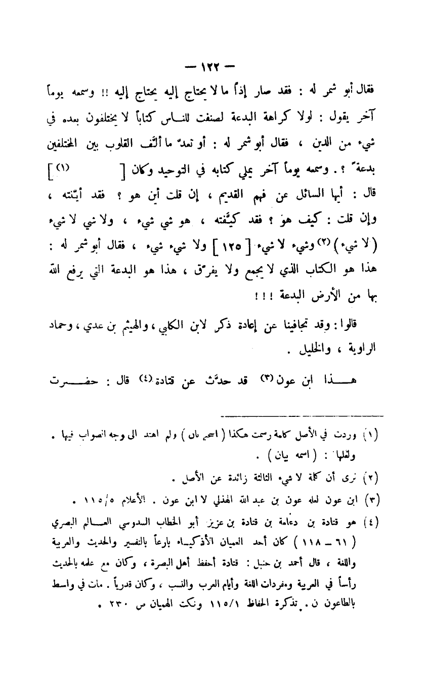 فقال أبو شمر له: فقد صار إذا ما لا يحتاج إليه يحتاج إليه! ! وسمعه يوما آخر يقول: لولا كراهة البدعة لصنفت للناس كتابا لا يختلفون بعده في شيء من الدين، فقال أبو شمر له: أو تعد ما ألف القلوب بين المختلفين بدعة؟ . وسمعة يوما آخر يملي كتابه في التوحيد وكان قال: أيها السائل عن فهم القديم، إن قلت أين هو؟ فقد أينته، وإن قلت: كيف هو؟ فقد كيفته، هو شي شيءن ولا شي لا شيء (لا شيء) وشيء لا شيء ولا شيء شيء، فقال أبو شمر له: هذا هو الكتاب الذي لا يجمع ولا يفرق، هذا هو البدعة التي يرفع الله بها من الأرض البدعة! ! !