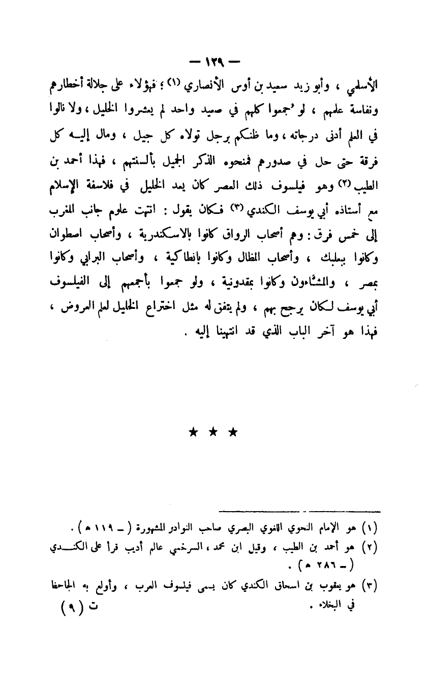 الأسلمي، وأبو زيد سعيد بن أوس الأنصاري؛ فهؤلاء على جلالة أخطارهم ونفاسة علمهم، لو جمعوا كلهم في صعيد واحد لم يعشروا الخليل، ولا نالوا في العلم أدنى درجاته، وما ظنكم برجل تولاه كل جبيل، ومال إليه كل فرقة حتى حل في صدورهم فمنحوه الذكر الجميل بألسنتهم، فهذا أحمد بن الطيب وهو فيلسوف ذلك العصر كان يعد الخليل في فلاسفة الإسلام مع أستاذه أبي يوسف الكندي فكان يقول: انتهت علوم جانب المغرب إلى خمس فرق: وهم أصحاب الرواق كانوا بالاسكندرية، وأصحاب اصطوان وكانو يعلبك، وزأصحاب المظال وكانوا بانطاكية، وأصحاب البرابي وكانوا بمصر، والمشاءون وكانوا بمقدونية، ولو جمعوا بأجمعهم إلى الفيلسوف أبي يوسف لكان يرجع بهم، ولم يتفق له مثل اختراع الخليل لعلم العروض، فهذا هو آخر الباب الذي قد انتهينا إليه.