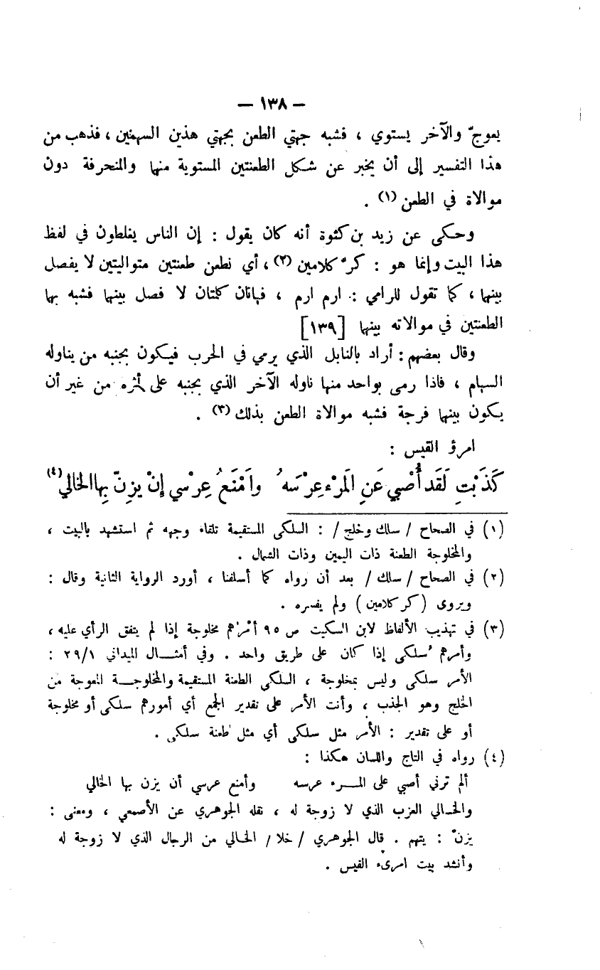 يموج والآخر يستوى، فشبه جهتي الطعن بجهتي هذين السهمين، فذهب من هذا التفسير إلى أن يخبر عن الشكل الطعنتين المستوية منها والمنحرفة دو موالاة في الطعن.