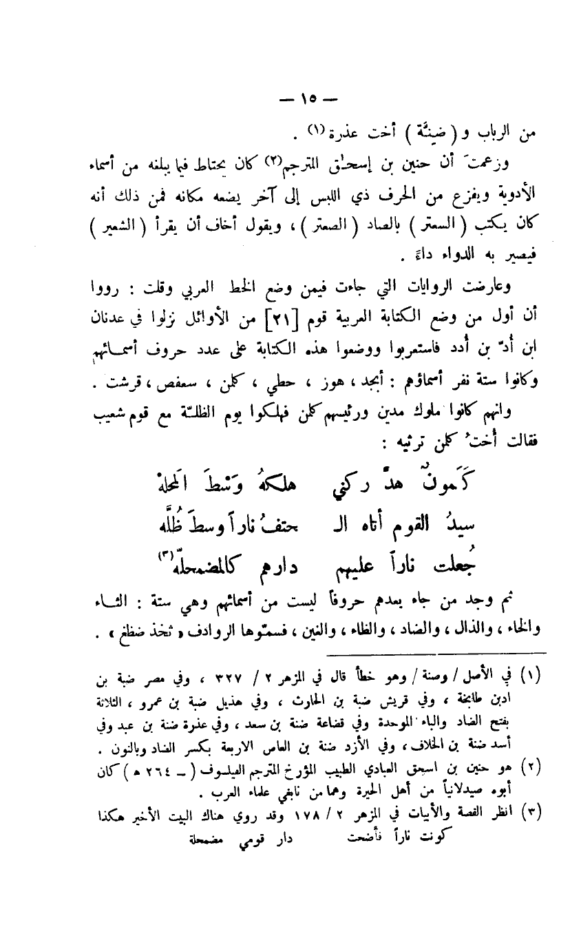 وزعمت أن حنين بن إسحاق المترجم كان يحتاط فيما يبلغه من أسماء الأدوية ويفزع من الحرف ذي اللبس إلى آخر يضعه مكانه فمن ذلك أنه كان يكتب (السمتر) بالصاد (الصمتر)، ويقول أخاف أن يقرأ (الشعير) فيصير به الدواء داءً.