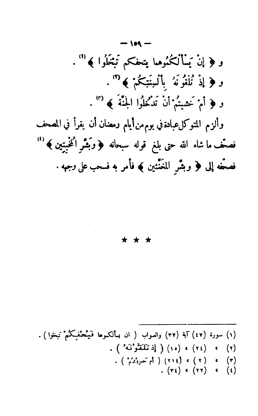 وألزم المتوكل عبادة في يوم من أيام رمضان أن يقرأ في المصحف فصحف ما شاء الله حتى بلغ قوله سبحانه {وبشر المخبتين} فصحفه إلى {وبشر المخنثين} فأمر به فسحب على وجهه.