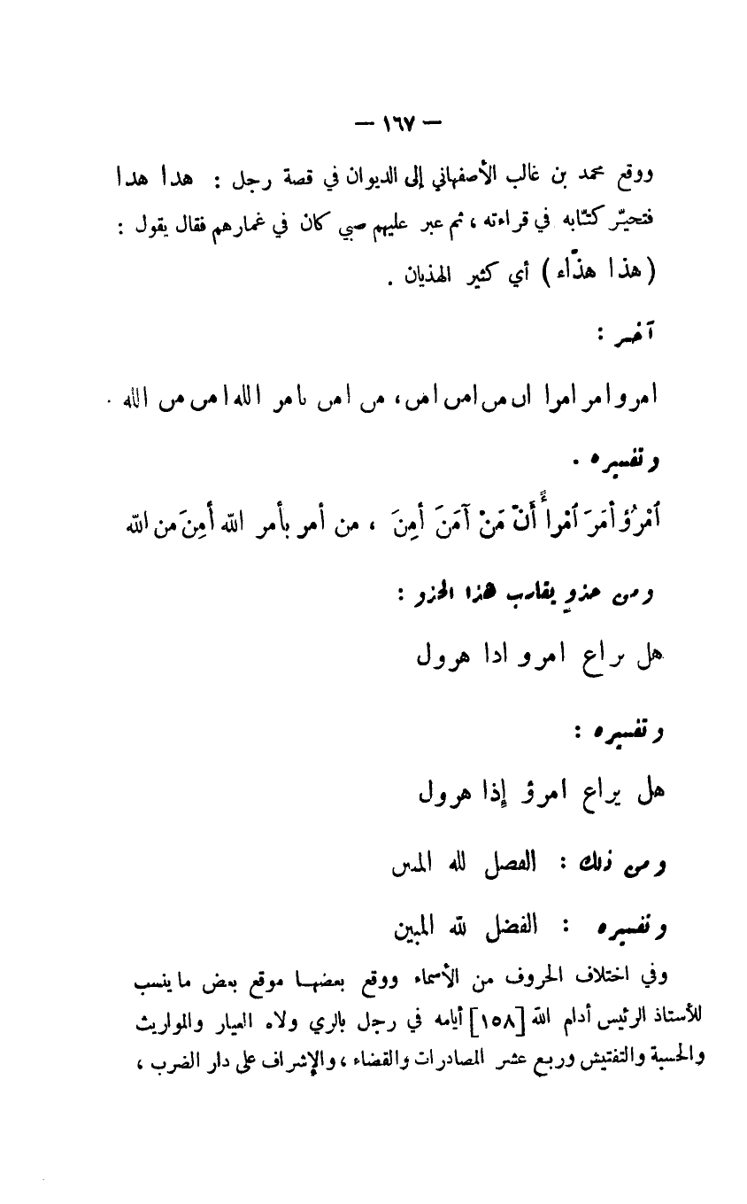 وفي اختلاف الحروف من الأسماء ووقع بعضها موقع بعض ما ينسب للأستاذ الرئيس أدام الله أيامه في رجل بالري ولاه العيار والمواريث والحسية والتفتيش وربع عشر المصادرات والقضاء، والإشراف على دار الضرب،