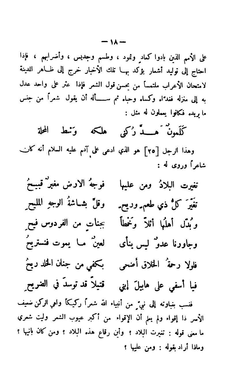 فنسل بغباوته إلى نبيٍّ من أنبياء الله شعرًا ركيكًا واهي الركن ضعيف الأسر ذا إقواء ولم يعلم أن الإقواء من أكبر عيوب العشر وليت شعري ما معنى قوله: تغير البلاد؟ وأين رقاع هذه البلاد؟ ومن كان بانيها؟ وماذا أراد بقوله: ومن عليها؟