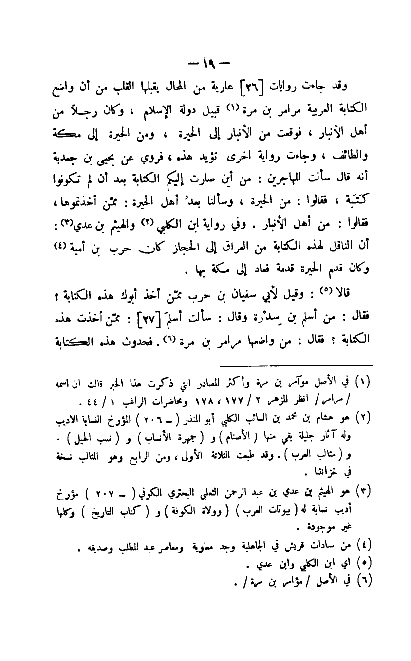 قالا: وقيل لأبي سفيان بن حرب ممّن أخذ أبوك هذه الكتابة؟ فقال: من أسلم بن سِدرة وقال: سألت أسلمَ: ممّن أخذت هذه الكتابة؟ فقال: من واضعها مرامر بن مرة. فحدوث هذه الكتابة