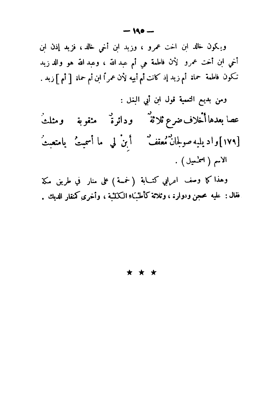 ويكون خالد ابن أخت عمرو، وزيد ابن أخي خالد، فزيد إذن ابن أخي ابن أخت عمرو لأن فاطمة هي أم عبد الله، وعبد الله هو والد زيد تكون فاطمة حماة أم زيد إذ كانت أم أبيه لأن عمرًا ابن أم حماة [أم] زيد.