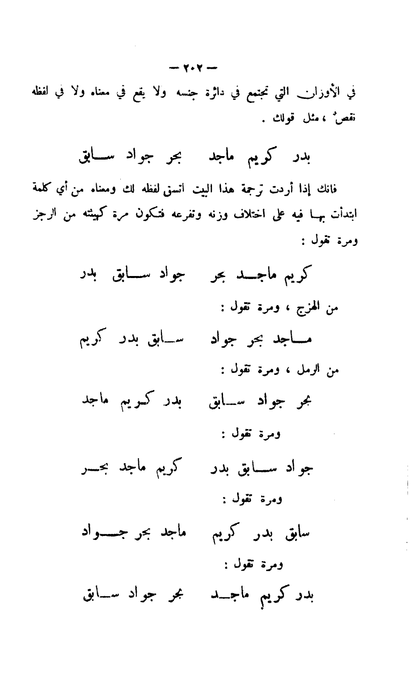 فانك إذا أردت ترجمة هذا البيت اتسق لفظه لك ومعناه من أي كلمة ابتدأت بها فيه على اختلاف وزنه وتفرعه فتكون مرة كهيته من الرجز ومرة تقول: