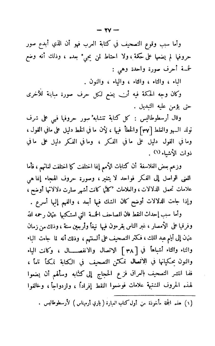 وقال أرسطو طاليس: كل كتابة تتشابه صور حروفها فهي على شرف تولد السهو الغلط والخطأ فيهم، لأن ما في الخط دليل على ما في القول، وما في القول دليل على ما في الفكر، وما في الفكر دليل على ما في ذوات الأشياء.