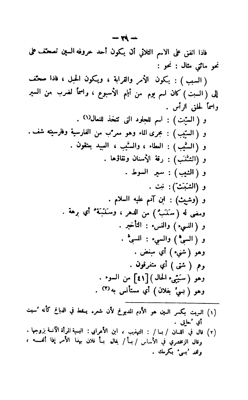(السبب): يكون الأمر والقرابة، ويكون الحبل، فإذا صحّف إلى (السبت) كان اسم يوم من أيام الأسبوع، واسمًا لضرب من السير واسمًا لحلق الرأس.