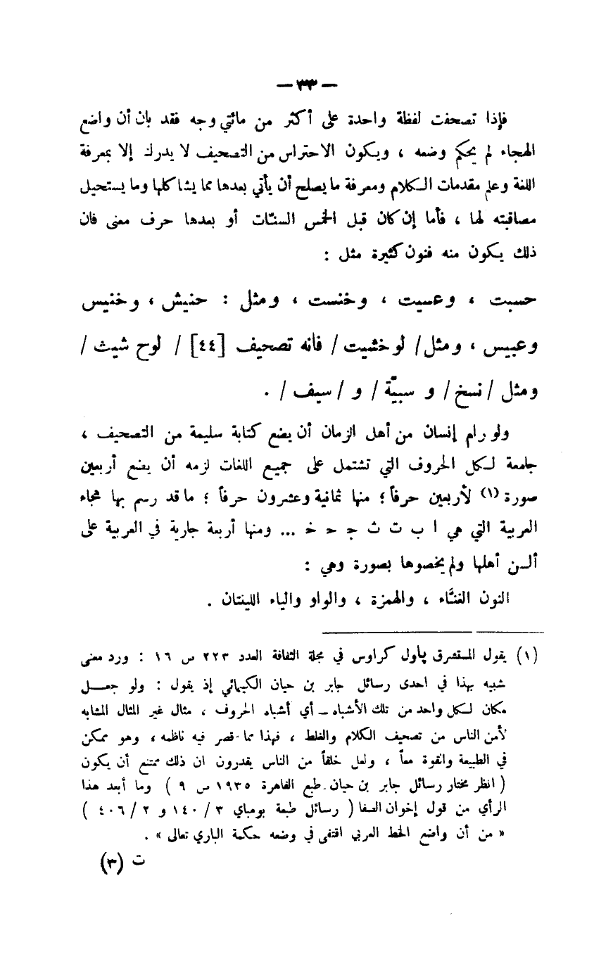 فإذا تصحفت لفظة واحدة على أكثر من مائتي وجه فقد بان أن واضع الهجاء لم يحكم وضعه، ويكون الاحتراس من التصحيف لا يدرك إلا بمعرفة اللغة وعلم مقدمات الكلام ومعرفة ما يصلح أن يأتي بعدها مما يشاكلها وما يستحيل مصاقته لها، فأما إن كان قبل الخمس السنات أو بعدها حرف معنى فإن ذلك يكون منه فنون كثيرة مثل: