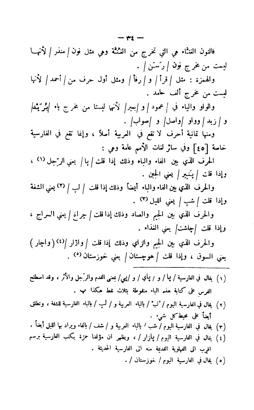 ومنها ثمانية أحرف لا تقع في العربية أصلاً، وإنما تقع في الفارسية خاصة وفي سائر لغات الأمم عامة وهي: