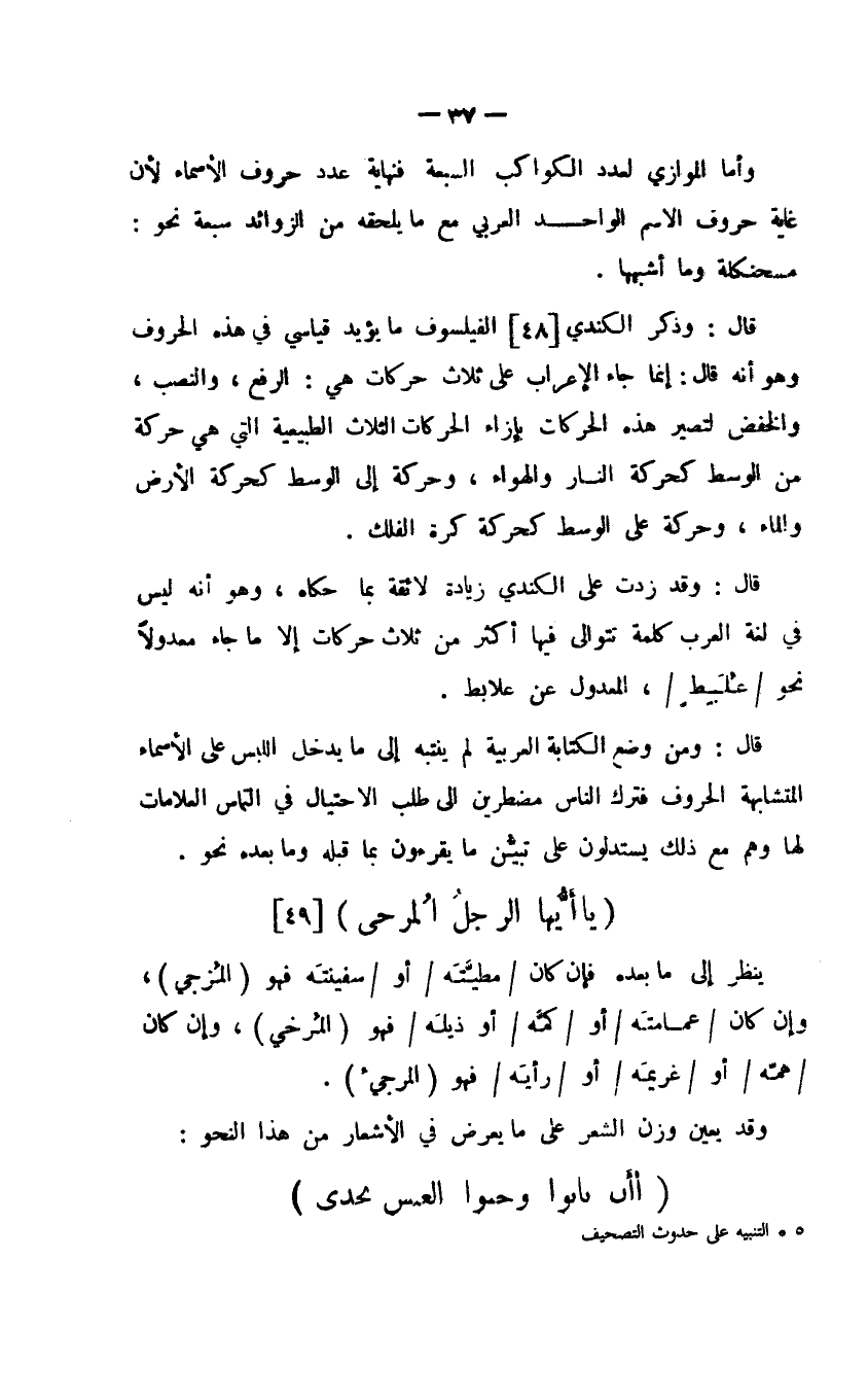 قال: وذكر الكندي الفيلسوف ما يؤيد قياسي في هذه الحروف وهو أنه قال: إنما جاء الإعراب على ثلاث حركات هي: الرفع، والنصب، والخفض لتصير هذه الحركات بإزاء الحركات الثلاث الطبيعية التي هي حركة من الوسط كحركة النار والهواء، وحركة إلى الوسط كحركة الأرض والماء، وحركة على الوسط كحركة كرة الفلك.