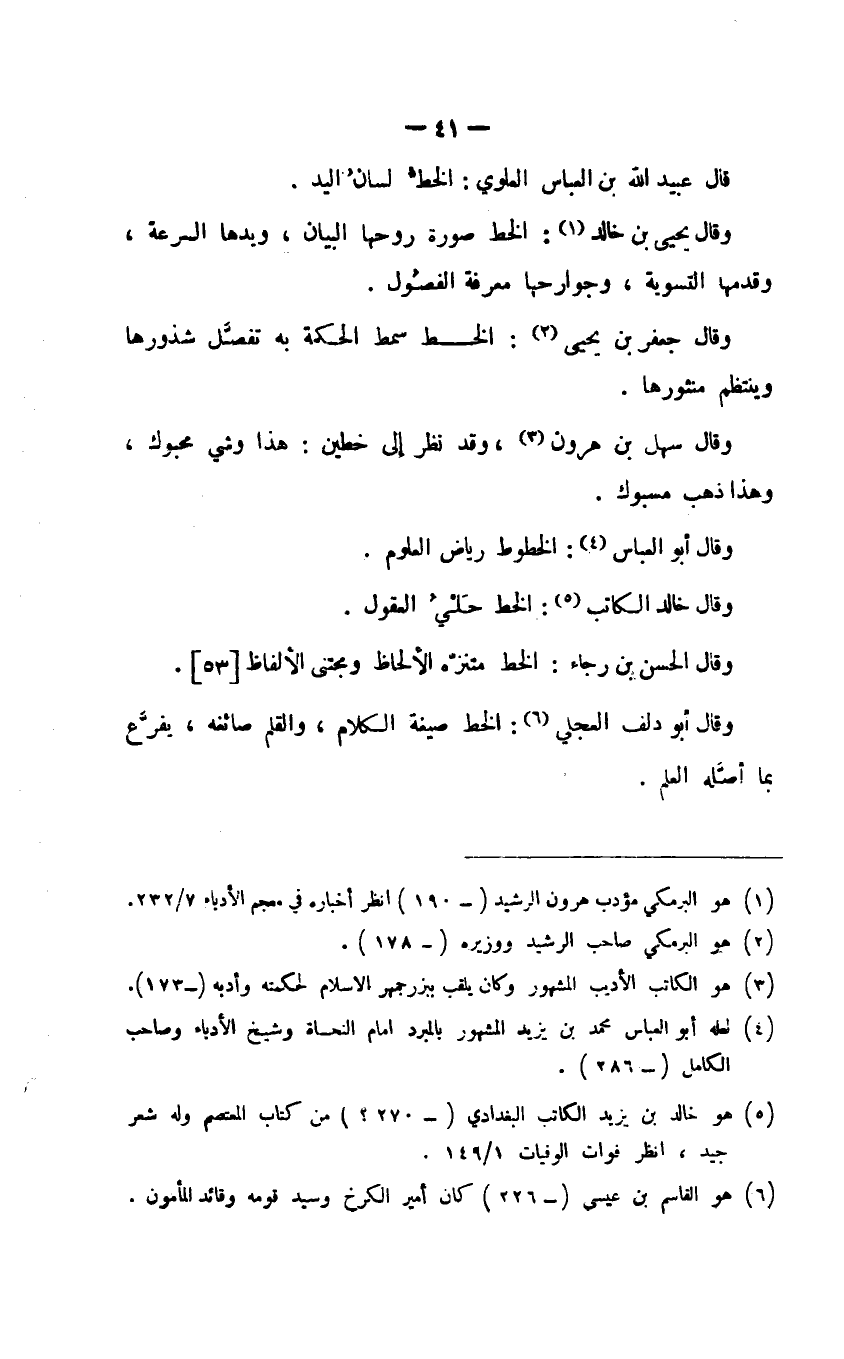 وقال يحيى بن خالد: الخط صورة روحها البيان، ويدها السرعة، وقدمها التسوية، وجوارحها معرفة الفصُول.