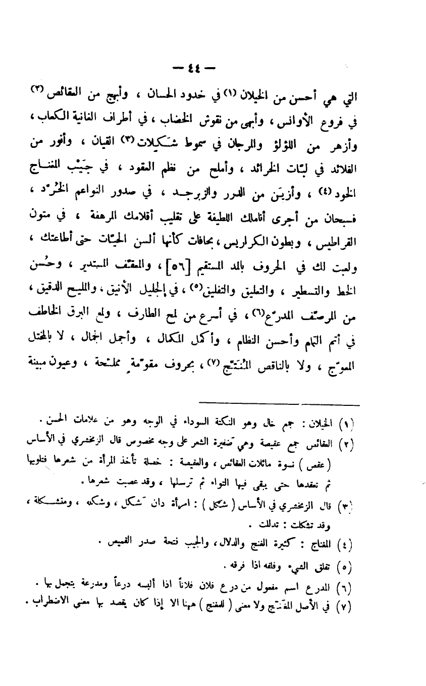 التي هي أحسن من الخيلان في خدود الحسان، وأبهج من العقائص في فروع الأوانس، وأبهى من نقوش الخضاب، في أطراف الغانية الكعاب، وأزهر من اللؤلؤ والمرجان في سموط شَكِلات القيان، وأنور من القلائد في لبّات الخرائد، وأملح من نظم العقود، في جَيْب المغناج الخود، وأزبَن من الدرر والزبرجد في صدور النواعم الخُرّد، فسبحان من أجرى أناملك اللطيفة على تقليب أقلامك المرهفة، في منون القراطيس، وبطون الكراريس، بحافات كأنها ألسن الحيّات حتى أطاعتك، ولعبت لك في الحروف بالمد المستقيم، والمعقّف المستدير، وحُسن الخط والتسطير، والتطبق والتفليق، في الجليل الأنيق، والمليح الدقيق، من المرصّف المدرّع، في أسرع من لمح الطارف، ولمع البرق الخاطف في أتم التمام وأحسن النظام/ وأكمل الكمال، وأجمل الجمال، لا بالمختل المموّج، ولا بالناقص المُنَتّج، بحروف مقوّمةٍ مملحة، وعيون مبينة