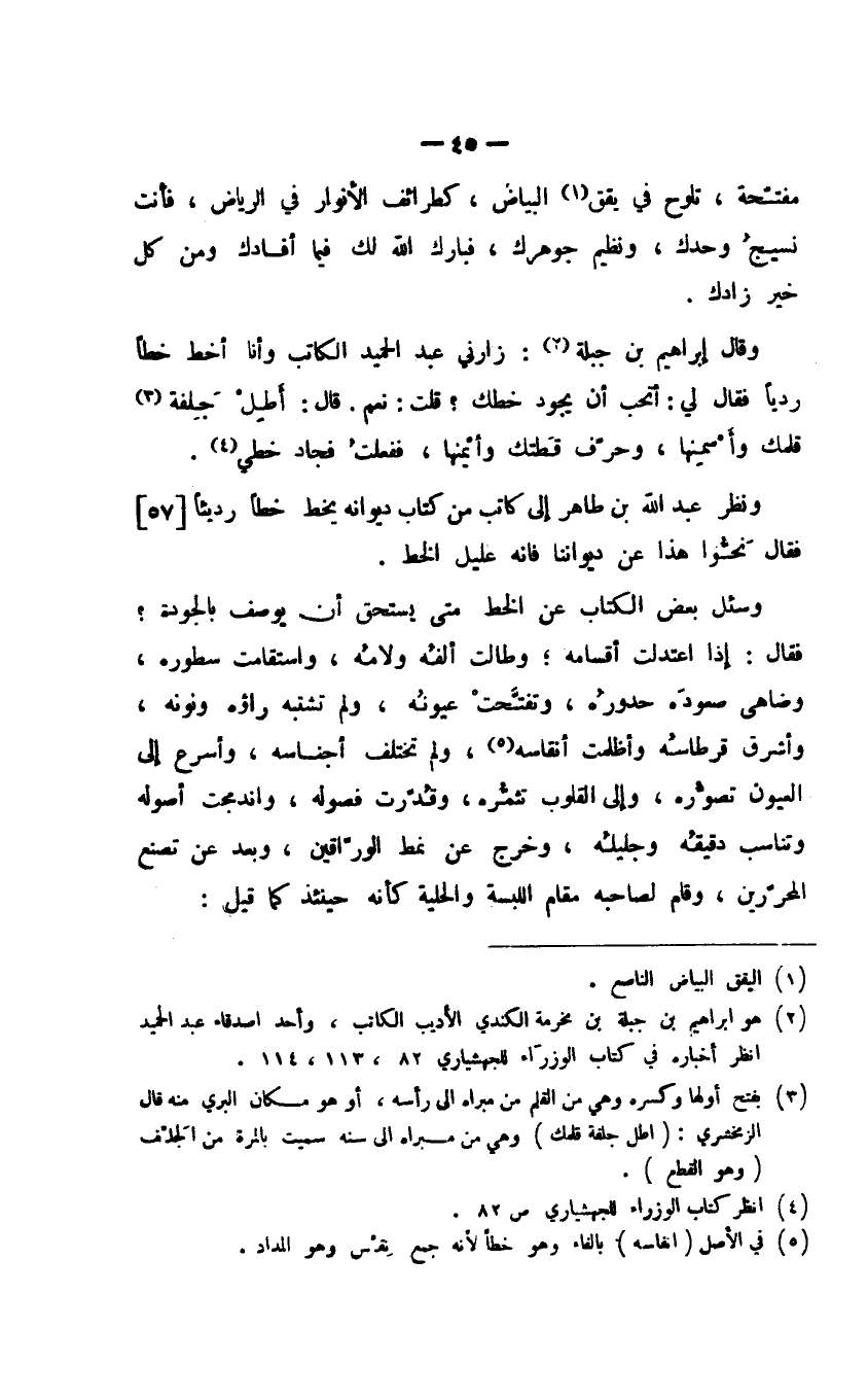 وقال إبراهيم بن جبلة: زارني عبد الحميد الكاتب وأنا أخط خطًا رديًا فقال لي: أتحب أن يجود خطك؟ قلت: نعم. قال: أَطِلْ جلفة قلمك وأَسْمِنها، وحرّف قعلتك وأيْمنها، ففعلتُ فجاد خطي.