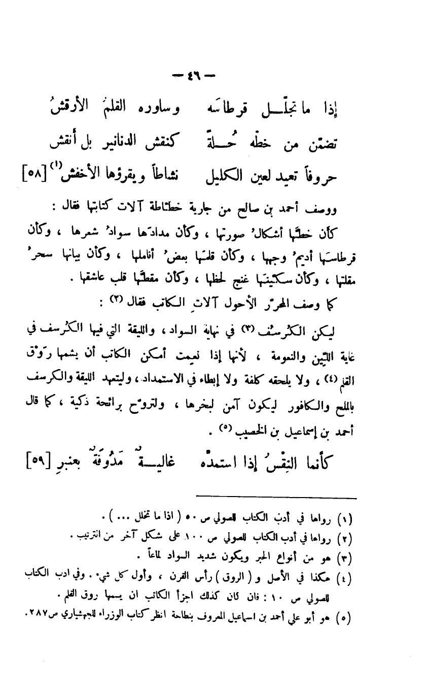 كأن خطَّها أشكالُ صورتها، وكأن مدادُها سوادُ شعرها، وكأن قرطاستها أديمُ وجهها، وكأن قلمها بعضُ أناملها، وكأن بيانها سحرُ مقلتها، وكأن سكينها غنج لحظها، وكأن مقطَّها قلب عاشقها.