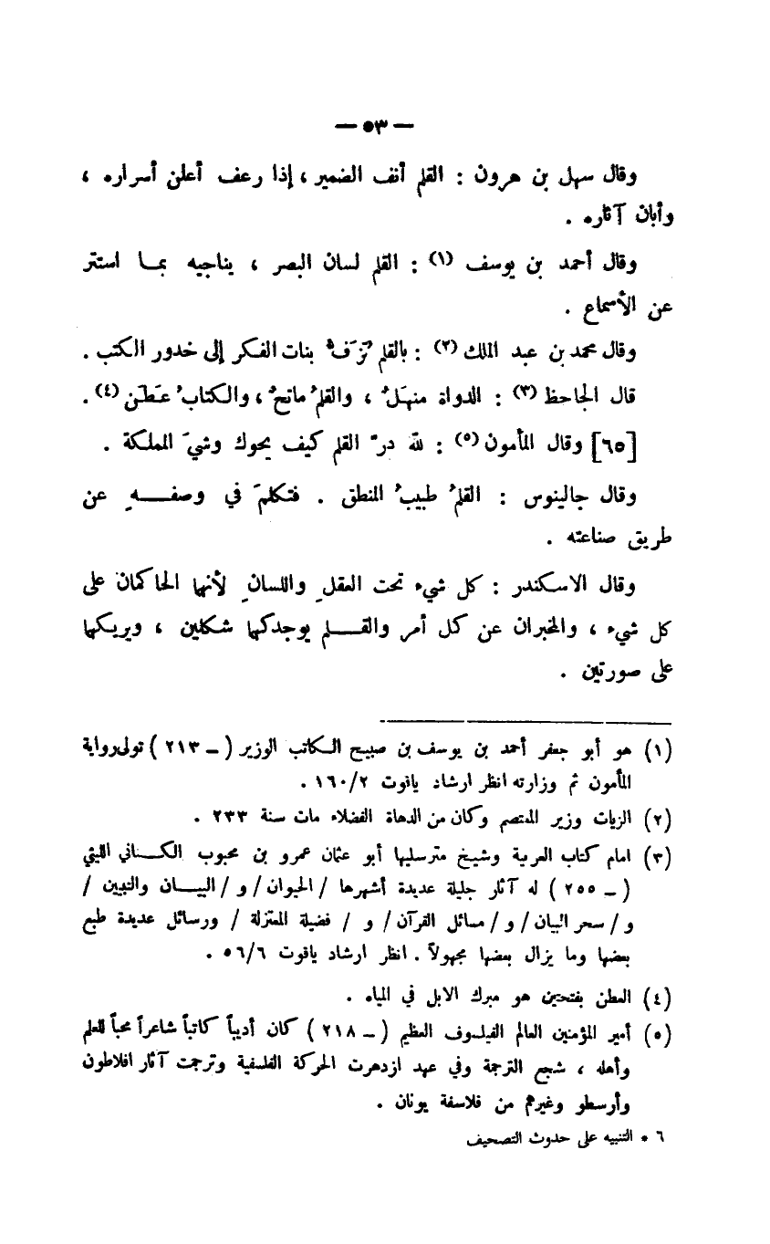 وقال الإسكندر: كل شيء تحت العقلَ واللسان لأنهما الحاكمان على كل شيء، والمخبران عن كل أمر والقلم يوجدكهما شكلين، ويريكهما على صورتين.