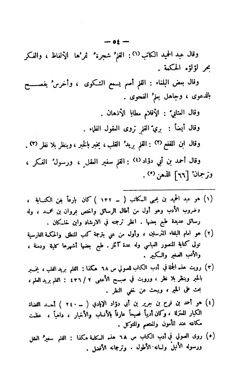 وقال عبد الحميد الكاتب: القلمُ شجرةٌ ثمرُها الألفاظ، والفكر بحر لؤلؤه الحكمة.
