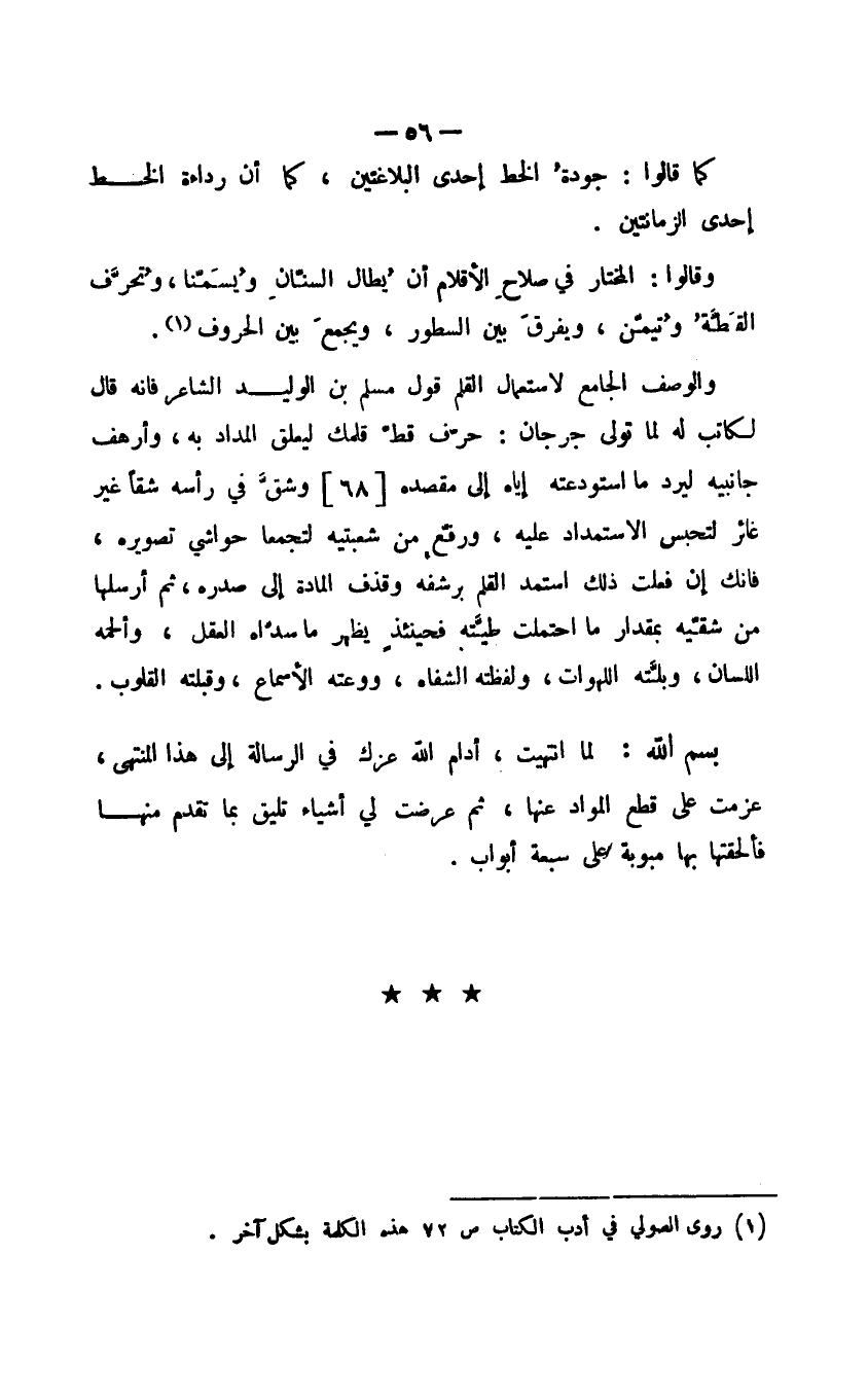 والوصف الجامع لاستعمال القلم قول مسلم بن الوليد الشاعر، فإنه قال لكاتب له لما تولى جرجان: حرّف قط قلمك ليعلق المداد به، وأرهف جانبيه ليرد ما استودعته إياه إلى مقصده وشقَّ في رأسه شقًا غير غائر لتحبس الاستمداد عليه، ورفع من شعبتيه لتجمعا حواشي تصويره، فإنك إن فعلت ذلك استمد القلم برشفه وقذف المادة إلى صدره، ثم أرسلها من شقيه بمقدار ما احتملت طيَّته فحينئذ يظهر ما سدّاه العقل، وألحمه اللسان، وبلَّته اللهوات، ولفظته الشفاه، ووعته الأسماع، وقبلته القلوب.
