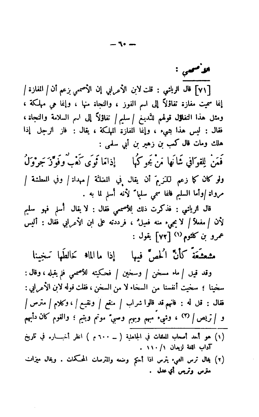 قال الرياشي: فذكرت ذلك للأصمعي فقال: لا يقال أسلم فهو سليم لأن/ مفعلاً/ لا يجئ منه فصيلٌ، فرددته على ابن الأعرابي فقال: أليس عمرو بن كلثوم يقول:
