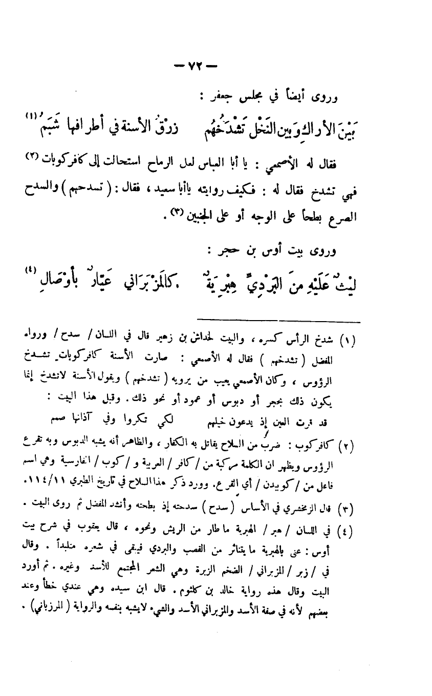 فقال له الأصمعي: يا أبا العباس لعل الرماح استحالت إلى كافر كوبات فهي تشدخ فقال له: فكيف روايته يا أبا سعيد، فقال: (تسدحهم) والسدح الصرع بطحًأ على الوجه أو على الجنبين.