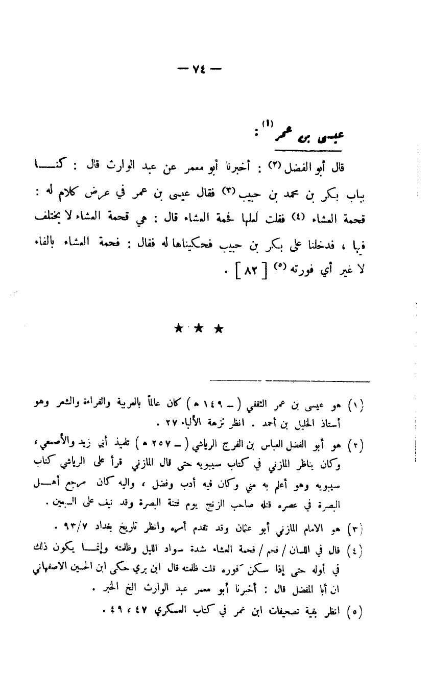 قال أبو الفضل: أخبرنا أبو معمر عن عبد الوارث قال: كنا بباب بكر بن محمد بن حبيب فقال عيسى بن عمر في عرض كلام له، فحمة العشاء فقلت لعلها فحمة العشاء قال: هي فحمة العشاء لا يختلف فيها، فدخلنا على بكر بن حبيب فحكيناها له فقال: فحمة العشاء بالفاء لا غير أي فورته.