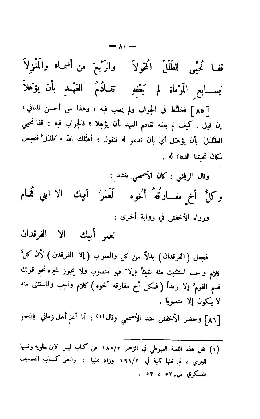 فخلط في الجواب ولم يصب فيه، وهذا من أحسن المعاني، إن قيل: كيف لم يعفه تقادم العهد بأن يؤهلا؟ فالجواب فيه: قفا نحيي الطال بأن يؤهل أي بأن ندعو له فنقول: أهلك الله يا طلل فنجعل مكان تحيتنا الدعاة له.