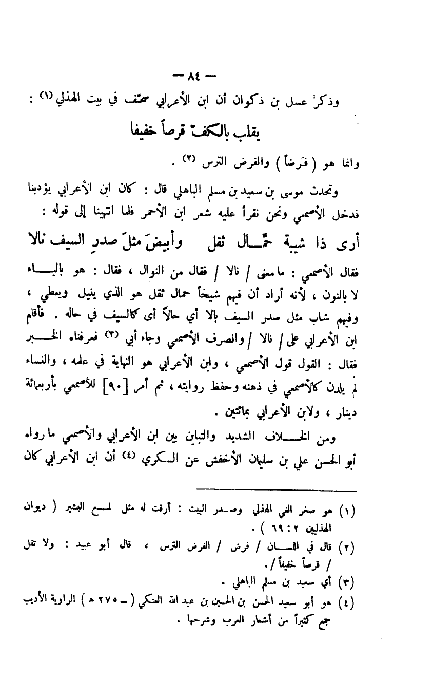 وتحدث موسى بن سعيد بن مسلم الباهلي قال: كان ابن الأعرابي يؤدبنا فدخل الأصمعي ونحن نقرأ عليه شعر ابن الأحمر فلما انتهينا إلى قوله: