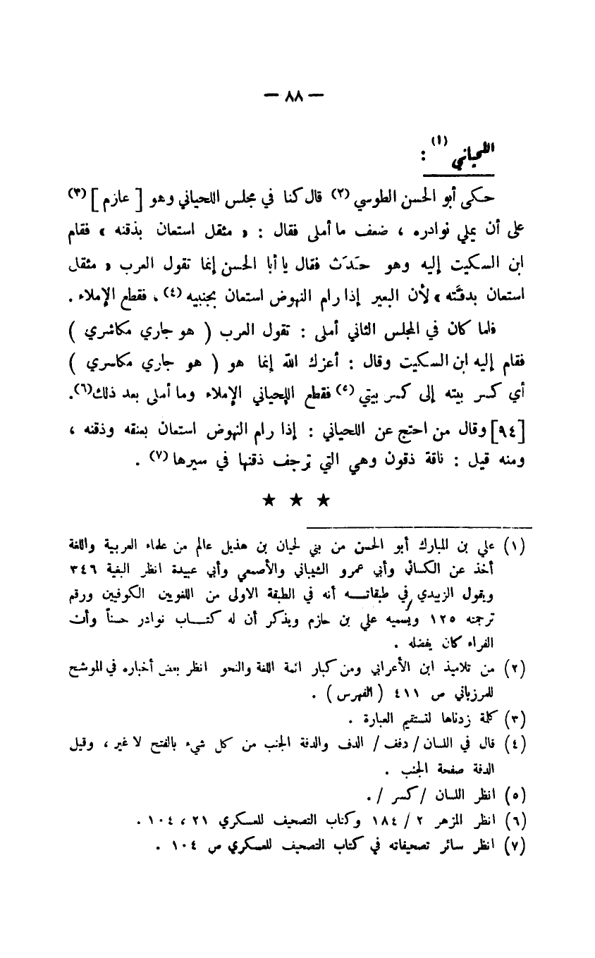 حكى أبو الحسن الطوسي قال كنا في مجلس اللحياني وهو (عازم) على أن يملي نوادره، ضعف ما أملى فقال: "مثقل استعان بذقنه" فقام ابن السكيت إليه وهو حدث فقال يا أبا الحسن إنما تقول العرب "مثقل استعان بدقته" لأن البعير إذا رام النهوض استعان بجنبيه، فقطع الإملاء.
