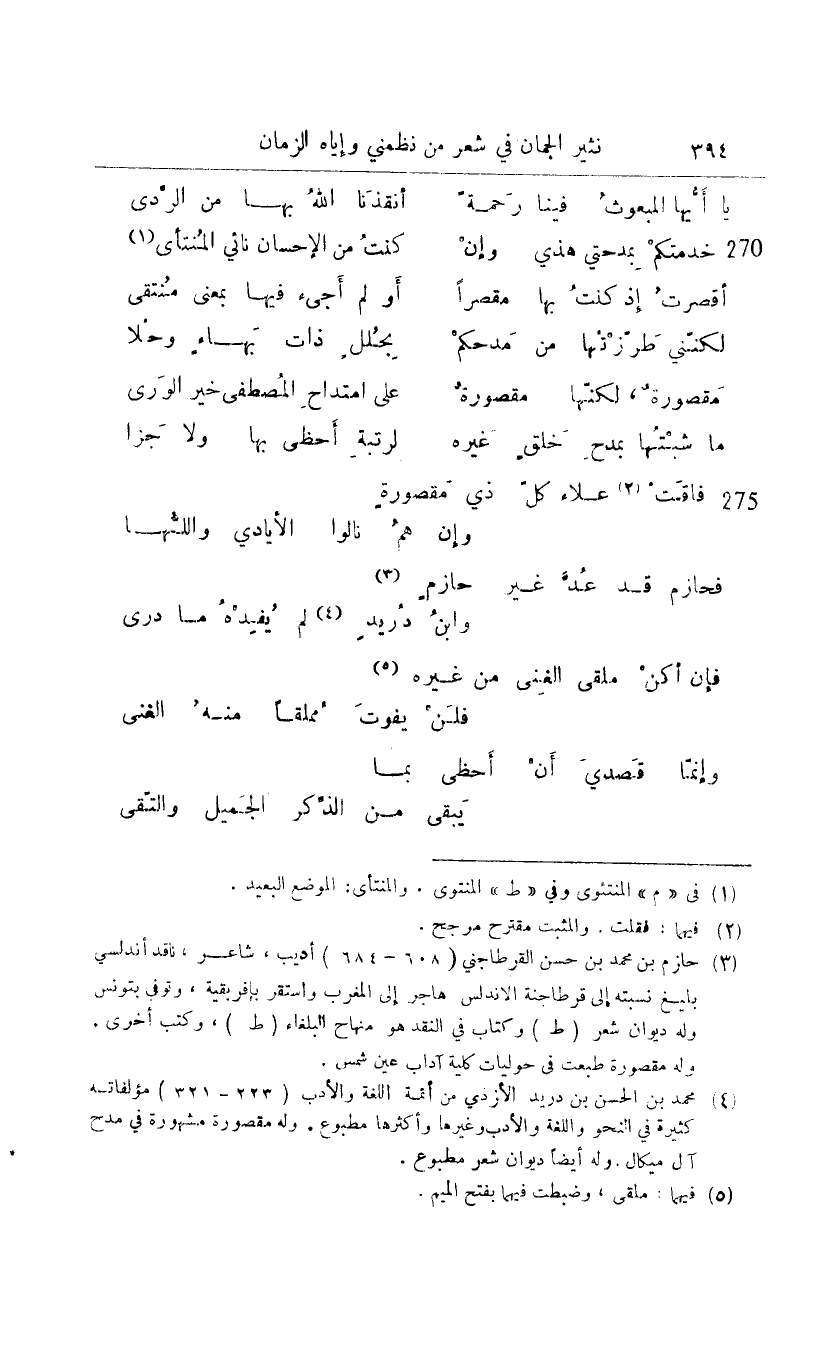 (¬3) حازم بن محمد بن حسن القرطاجني (608 - 684) أديب، شاعر، ناقد أندلسي بليغ نسبته إلى قرطاجنة الاندلس هاجر إلى المغرب واستقر بإفريقية، وتوفي بتونس وله ديوان شعر (ط) وكتاب في النقد هو منهاح البلغاء (ط)، وكتب أخرى. وله مقصورة طبعت في حوليات كلية آداب عين شمس.
