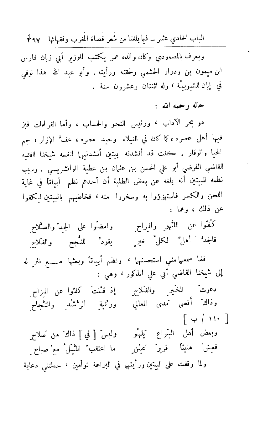 فلما سمعهما مني استحسنهما، ونظم أبياتا وبعثها مع نثر له إلى شيخنا القاضي أبي علي المذكور، وهي:
