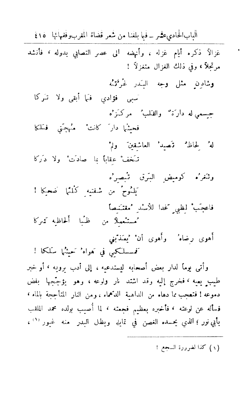 وأتى يوما لدار بعض أصحابه ليستدعيه، إلى أدب يرويه، أو خبر طيب يعيه، فخرج إليه وقد اشتد نار ولوعه، وهو يؤجّجها بفض دموعه! فتعجب مما دهاه من الداهية الدّهماء، ومن النار المتأججة بالماء، فسأله عن لوعته، فأخبره بعظيم فجعته، لما أصيب بولده محمد الملقب بأبي نور؛ الذي يحسده الغصن في تمايله ويظل البدر منه غيور (¬1)،
