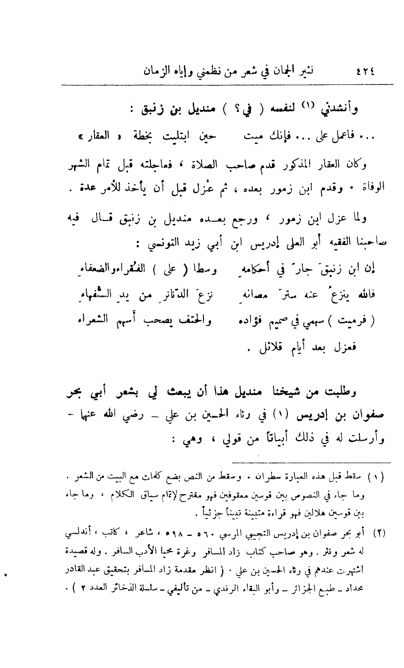 (¬2) أبو بحر صفوان بن إدريس التجيبي المرسي 560 - 598، شاعر، كاتب، أندلسي له شعر ونثر. وهو صاحب كتاب زاد المسافر وغرة محيا الأدب السافر. وله قصيدة اشتهرت عندهم في رثاء الحسين بن علي. (انظر مقدمة زاد المسافر بتحقيق عبد القادر محداد-طبع الجزائر-وأبو البقاء الرندي-من تأليفي-سلسلة الذخائر العدد 2).