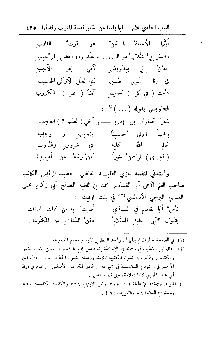 (¬2) قال ابن الخطيب في ترجمته في الإحاطة إنه فاضل مجمع على فضله، حسن الخط والشعر والكتابة. وذكره في شعراء الكتيبة الكامنة ووصفه بالشعر والخطابة. وعدّه ابن الأحمر في مستودع العلامة في شيوخه. غادر المترجم الأندلس، وخدم في دولة أبي عنان المريني كاتبا للعلامة وتولى قضاء فاس. (انظر في ترجمته: الإحاطة 2:215 ونيل الابتهاج 266 والكتيبة الكامنة 520 ومستودع العلامة 56 والتعريف 64).