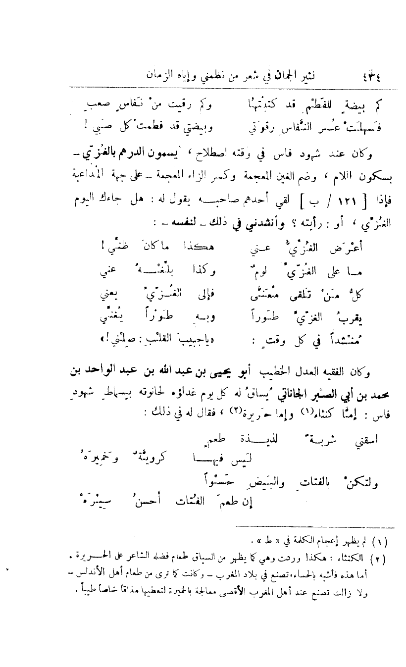 وكان عند شهود فاس في وقته اصطلاح، يسمون الدرهم بالغزّي- بسكون اللام، وضم الغين المعجمة وكسر الزاء المعجمة-على جهة المداعبة فإذا [121/ب] لقي أحدهم صاحبه يقول له: هل جاءك اليوم الغزّي، أو: رأيته؟ وأنشدني في ذلك-لنفسه-:
